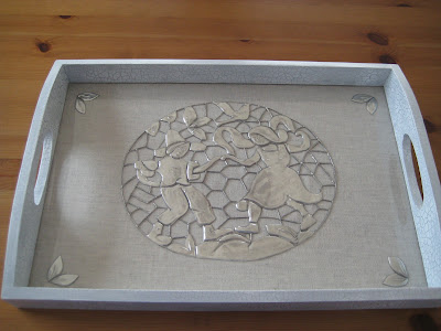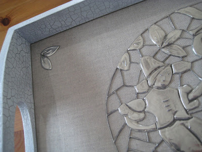 O estanho não é daqueles materiais com os quais eu trabalho mais, mas também gosto. Embora não seja muito fácil, também não é muiiiitooo dificil. Há algumas semanas pediram-me para fazer um tabuleiro em estanho para oferecer numa renovação de votos de casamento. O resultado final é o que se segue, um tabuleiro craquelado em cinza e branco com tecido em algodão e linho.