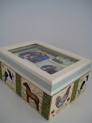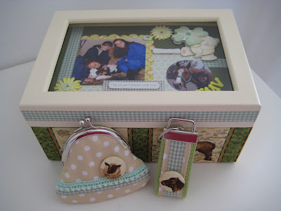 A caixa que se segue é para oferecer a uma estudante de medicina veterinária no seu traçar de capa. Conjugaram-se elementos relativos ao curso, nomeadamente com a escolha do tecido e dos elementos constantes no layout em scrapbooking (tampa).